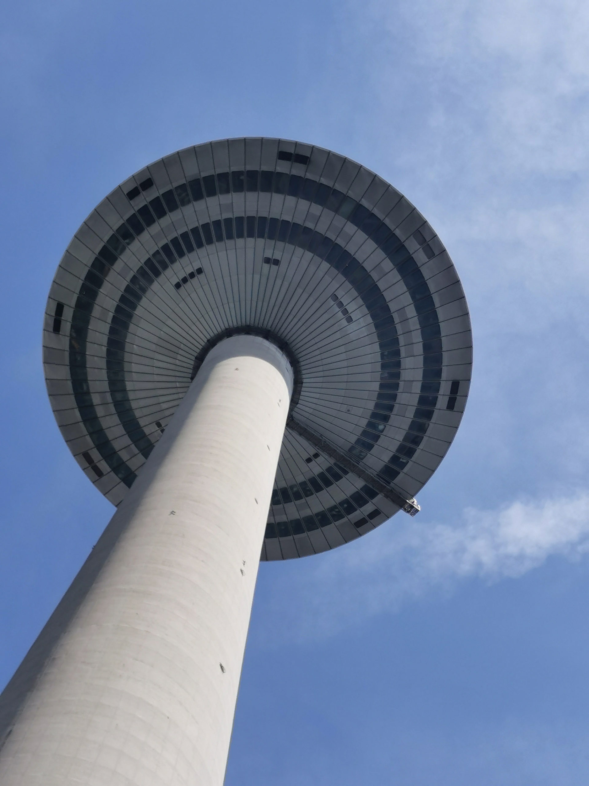 The ring foundations for the Europaturm are 18.50 meters deep in the marl soil, which has been completely filled with cement and silicate to make it sustainable. The tower shaft was raised with a climbing formwork, an annular mold, on which the workers concreted meter by meter in the height. The shaft tapers upwards: he has twenty meters in diameter at the foot, eleven meters directly under the pulpit. The pulpit is 227 meters (745 feet high), has six floors and a diameter of 59 meters (194 feet), making it the widest in the world. It offers a unique view of the entire Rhine-Main Area and the Frankfurt skyline. Unfortunately, the observation deck has been closed to visitors for more than 10 years and can not be visited. Today, the TV tower is used for communication purposes and as an elevator test tower of the Swiss company Schindler Aufzüge.