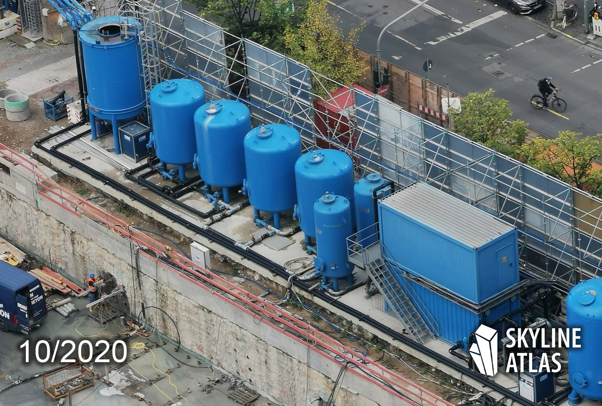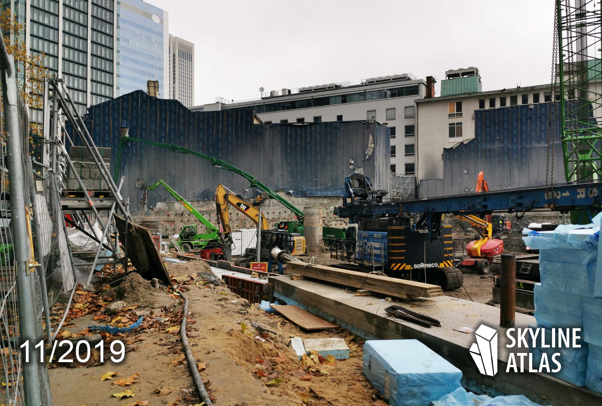 Status November 2019: The soil stabilization wall is being constructed around the entire FOUR construction site as a construction pit shoring. This 25 to 40 meter deep steel-concrete wall protects the area from the enormous ground pressure of the neighbouring high-rise buildings in preparation for special foundation engineering. For some time now, around 380 foundation piles have also been drilled.