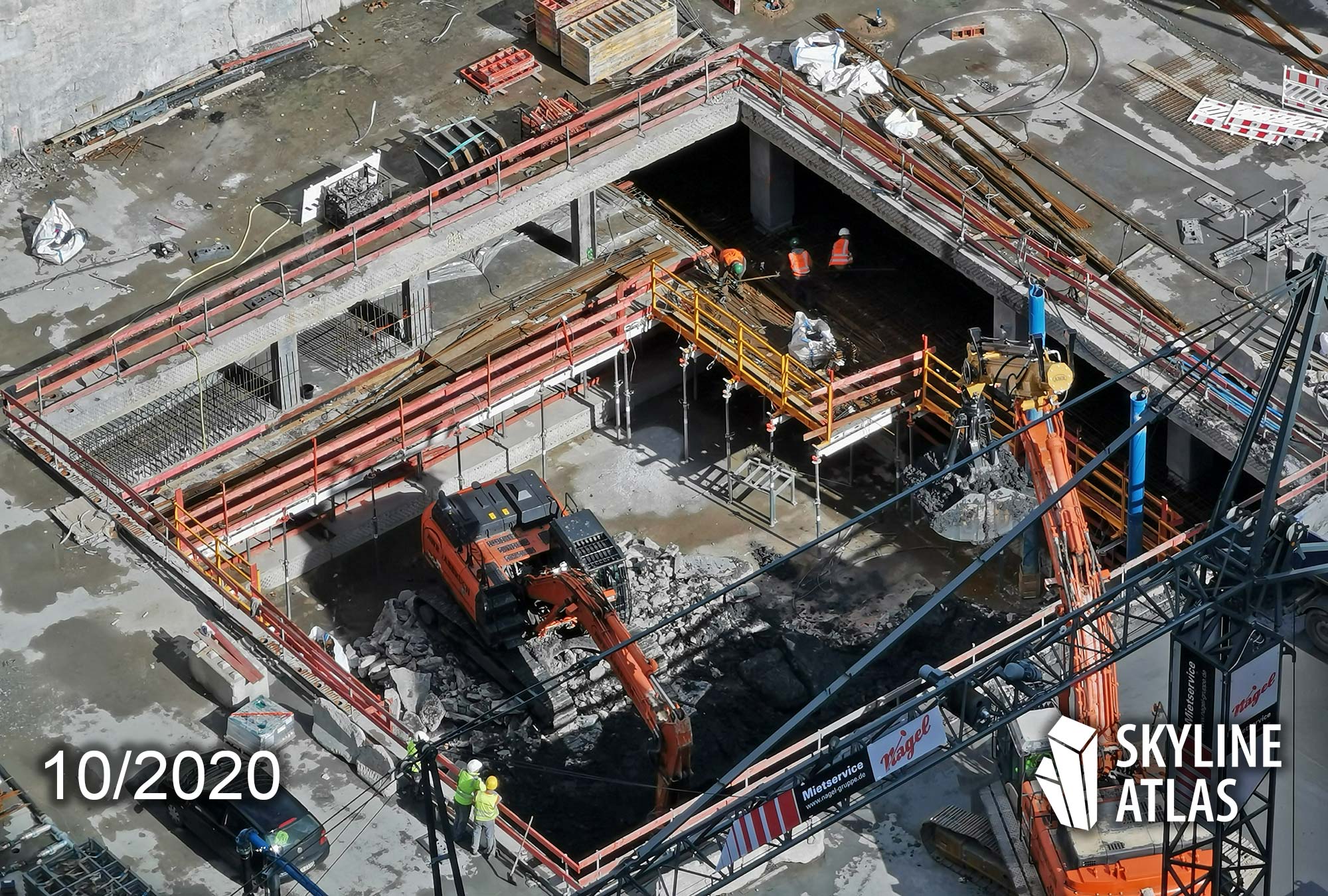 Status June 2020: The concreting work of the 1st base plate has started. In the future, this 60 centimeter (2 feet) high cover will rest on the primary piles that have already been installed in the ground. 1,600 tons of steel and 7,100 cubic meters (35,300 cubic feet) of concrete are processed in the lid. The cover dissipates all lateral forces that act on the diaphragm wall due to the neighboring buildings, thereby stiffening the excavation pit so that the basement levels can be successively produced under the cover. Construction workers and machines work their way down through eight openings in the lid to a total depth of approx. 28 meters (92 feet), from where they excavate the earth.