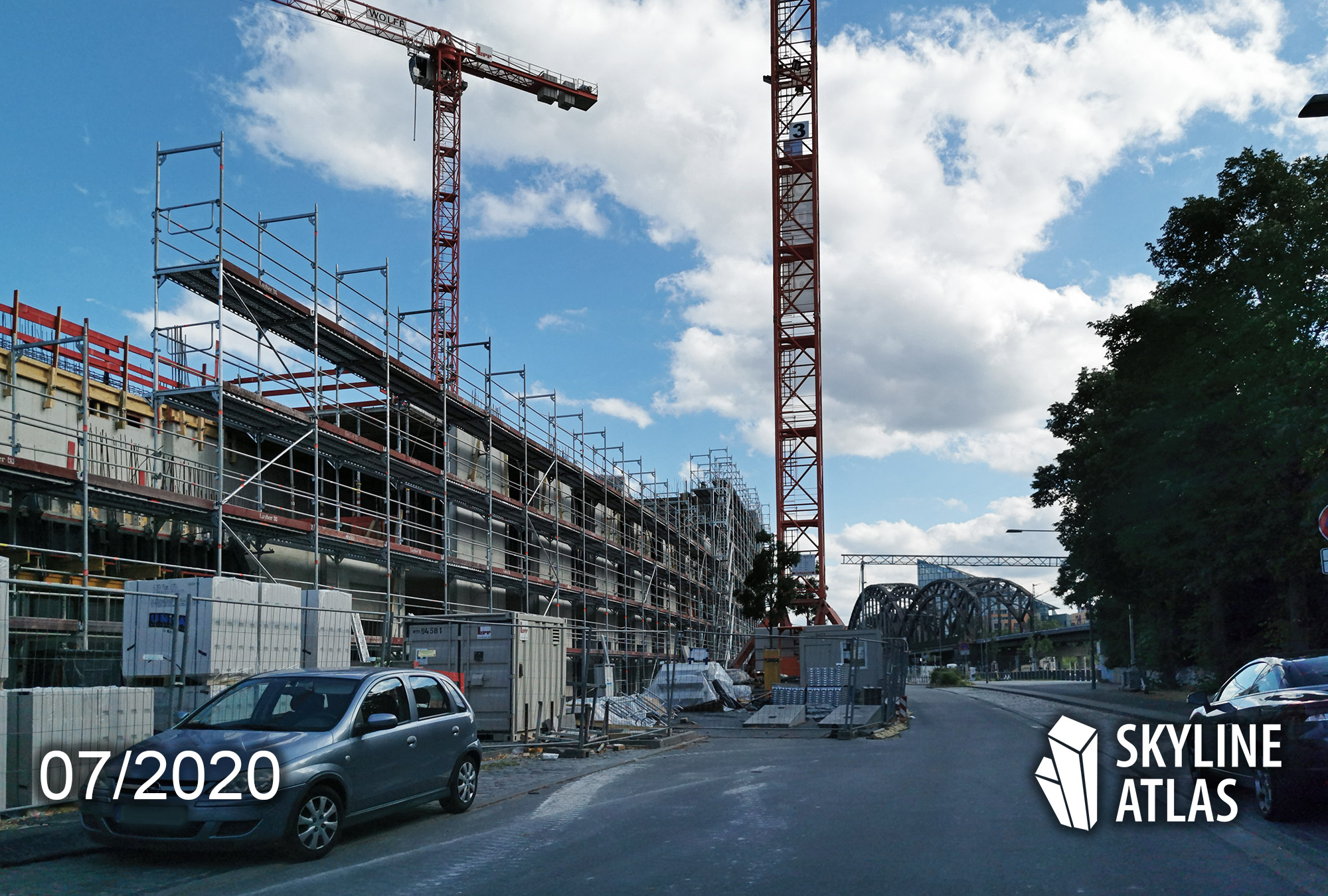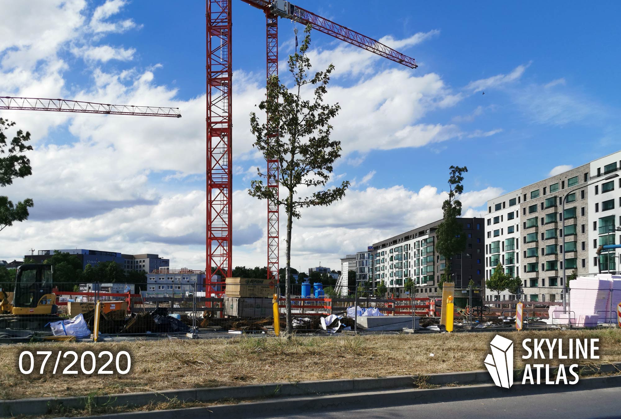 As of August 2019: The individual colors in this paragraph refer to the map below. The construction work on the block development in the eastern part (red) will be completed in the coming months. The construction work on the three towers in the construction area south are in full swing (yellow/green). The construction work on the construction fields North (blue) and the southern Molenkopf (pink) have not started yet.