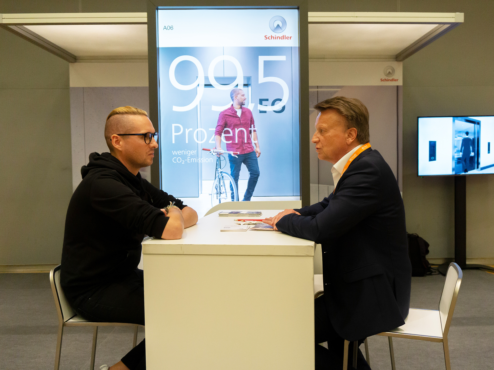At Schindler, however, we keep an eye on the entire life cycle of elevators. An elevator is in operation for decades and needs to be maintained. Has anyone ever thought about how this can be done more sustainably? Schindler was the first company in the industry to develop truly sustainable elevator maintenance with Schindler Green Service. Through digital services, it actually produces 99.5 percent fewer emissions than conventional maintenance. And here I’m not talking about CO2 compensation in the fine print like some others, but real reduction. TÜV Rheinland has also certified this. Schindler is committed to recycling all materials and not sending waste to landfills. The vehicle fleet in Germany has been converted to consistent e-mobility for some time now. I could speak for quite a while on the subject, but on to the next question.