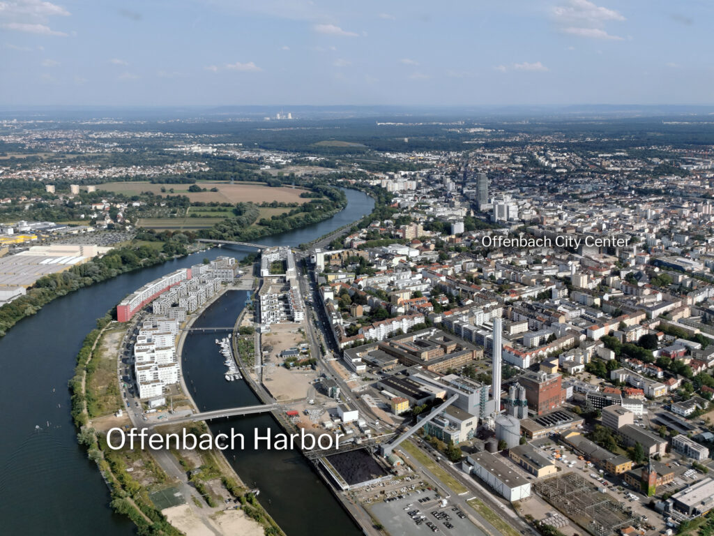 Offenbach Harbor is a new district that will be built directly on the river in Offenbach by 2024. Offenbach Harbor is located west of Offenbach city center and is a place to live, work, relax, study, and shop. Hundreds of new apartments and numerous commercial buildings have already been built here. The development area is subdivided into three construction phases from east to west, with the development in the eastern part being most advanced. The Offenbach Harbor (in German: Hafen Offenbach) is also known as the Harbor District (in German: Hafenviertel).